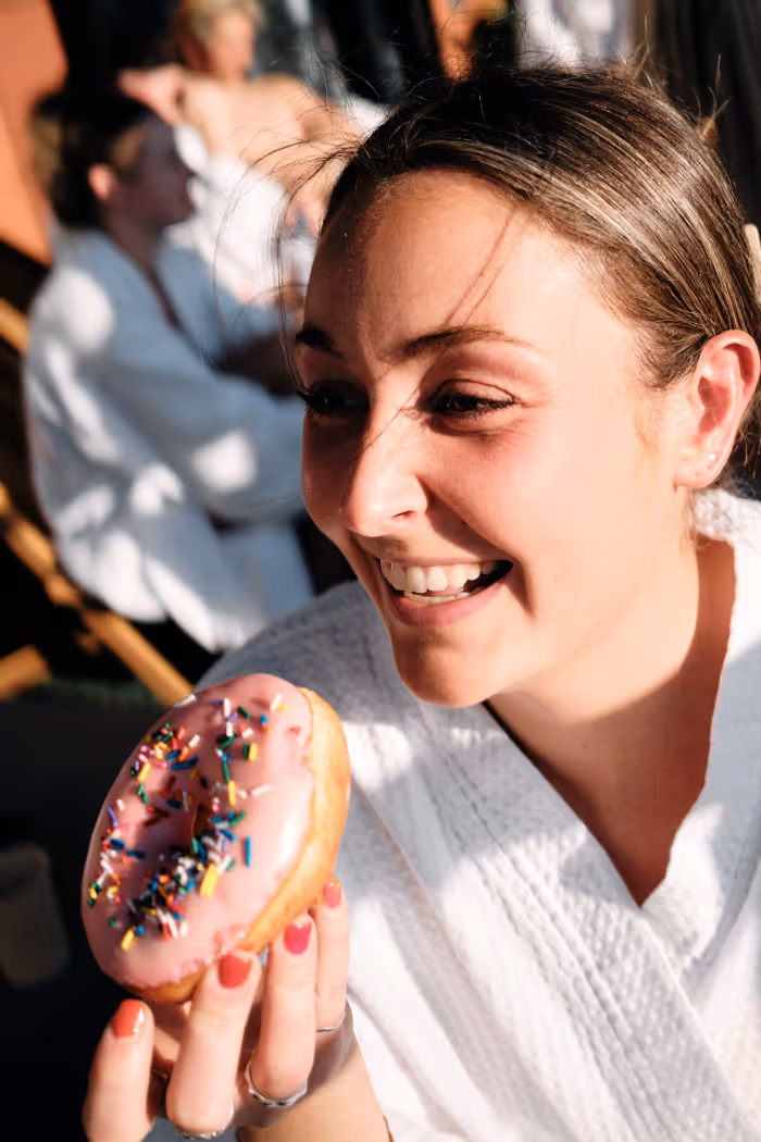 We supply towel, robes, and cups for drinks, however you are welcome to bring and use your own if you prefer. A water bottle can be nice to bring into the sauna or staying better hydrated. Please don't bring any glass!